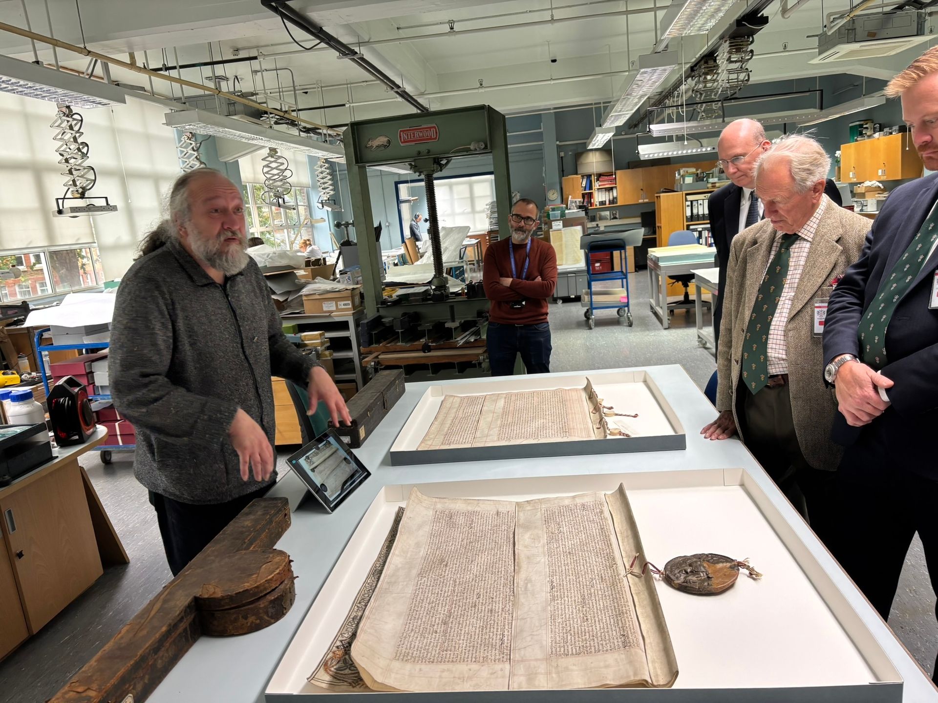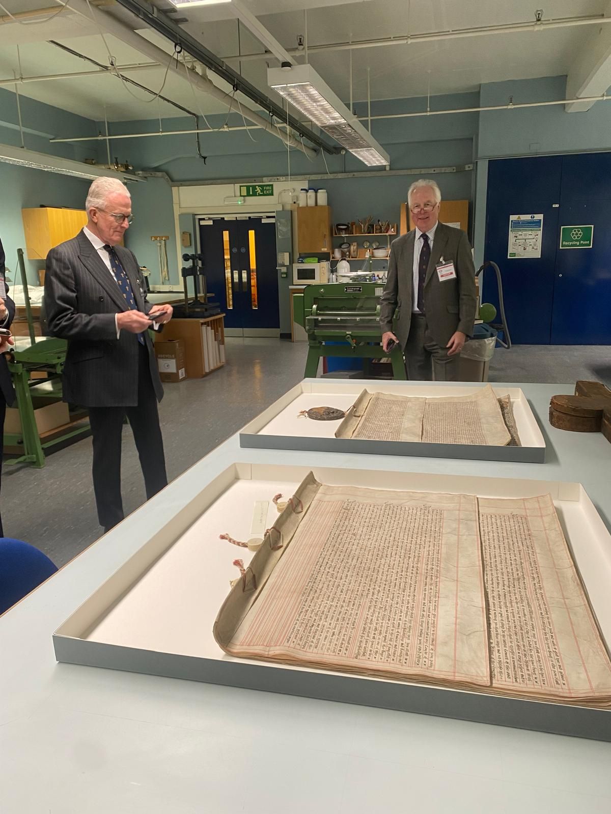 Miles gathered us around the large table at the centre of the spacious studio. He then, in an ‘un-boxing’, removed the lids of the two storage boxes on the table to reveal the Charter and Ordinances. These had been taken from their original boxes, where they had been tightly rolled, and gently flattened, cleaned and conserved. Tim walked us through the processes that had been used for this, explaining that there had been a need for a small repair to the Charter’s decorated initial. He also emphasised the value of transferring the documents to the micro-environment of a purpose-built conservation box. The Studio are preparing a video of the steps in the work so that the details can be shared with the Company.