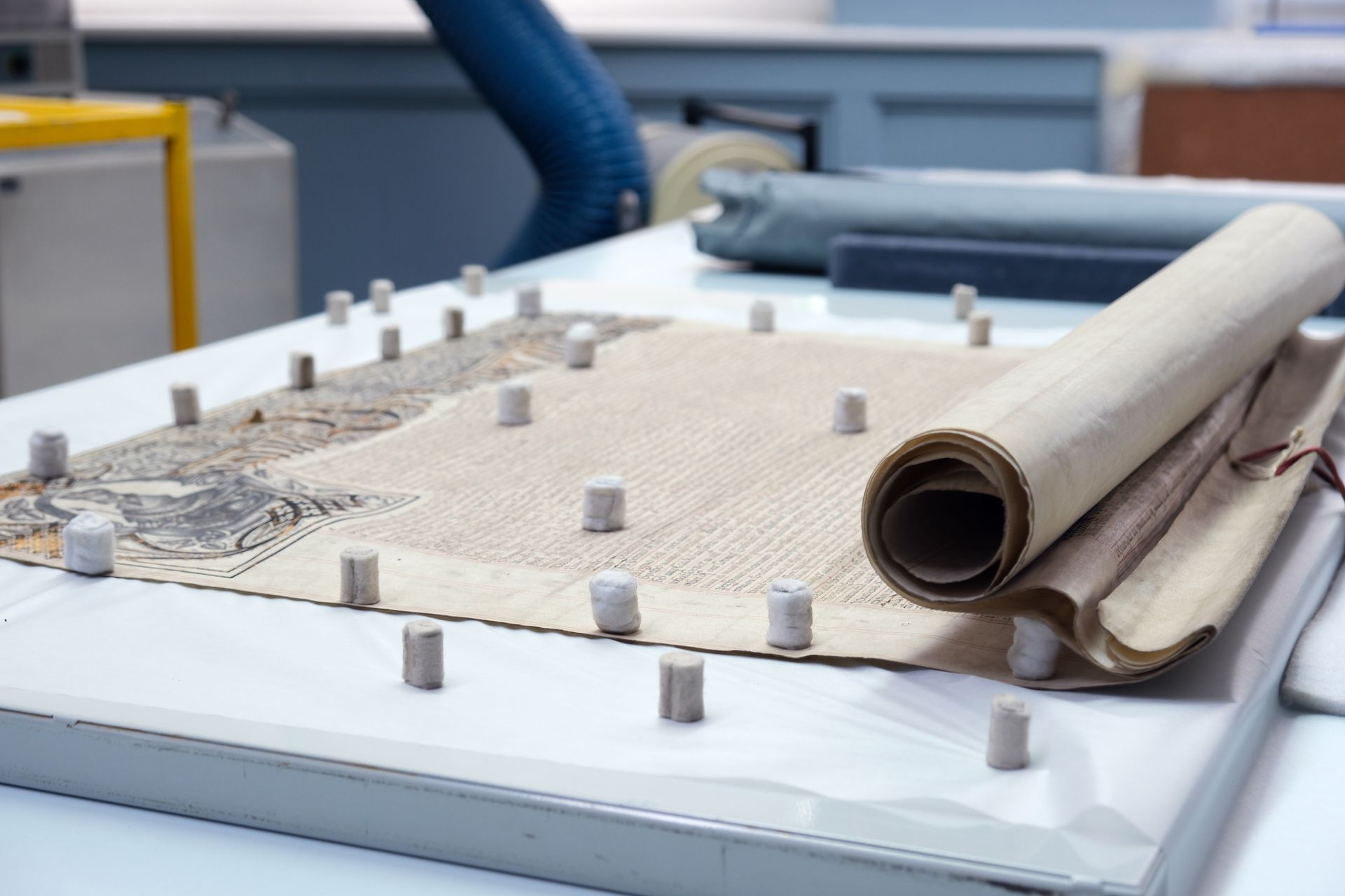 A few things caught our attention: The repair to the initial of the Charter was almost invisible, other than being revealed by the thin slivers of Japanese handmade paper on the back of the document. A centimetre diameter hole to one sheet was caused by an insect bite to the animal that provided the skin, and had grown as it was stretched as part of the preparation process. The Ordinances box is lined with the pages of an astronomy book written in Latin. The three seals on the Ordinances are protected by beautiful and precisely turned threaded ivory boxes.